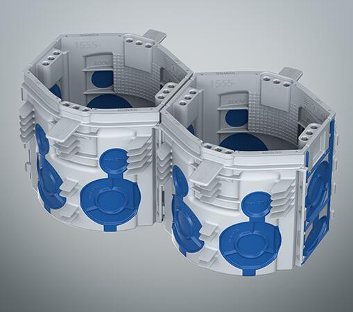 Az átvezető híd a sorolt dobozok között könnyen eltávolítható (kitörhető), így az eszközök csatlakoztatását egymáshoz térbeli elválasztás nélkül lehet kialakítani. Az előre szerelt, sorolt csatlakozó aljzatok így gyorsan és könnyen telepíthetők. A szerelvények rögzítése még könnyebb lett a rugalmas karommezők és a 4x3-as csavarházak kialakítása által. Az új szabályozható kiemelőkeret vakolatkiegyenlítést tesz lehetővé 10-35 mm-es tartományban.