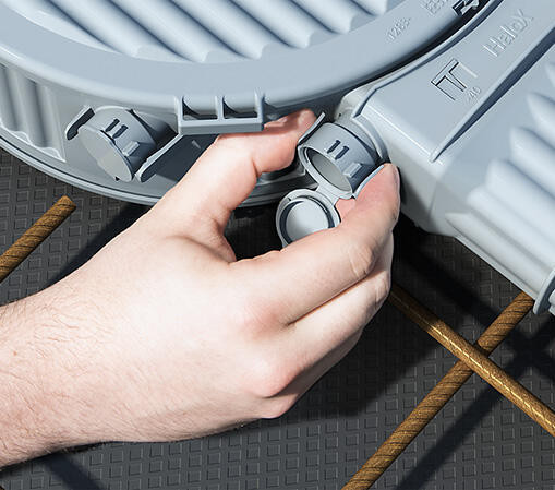 Az alaktartó HaloX® dobozrendszer moduláris felépítésű a helyszínen öntött betonba való beillesztéshez. Három házátmérő és nagyszámú kerek, szögletes és univerzális előlappal lehetővé teszi lámpatestek és hangszórók beépítését maximum 250 mm-es beépítési átmérőig beleértve a kéregpanel betont is. Trafótartó alagúttal a rendszer elegendő helyet biztosít az eszközök, például a LED-meghajtók / trafók számára. Opcionális emelő gyűrűk a beépítési mélység növeléséhez. Minden előlap nedvességtaszító, és még az első megerősítés (betonháló) lerakása előtt is pontosan pozícionálható és felszegezhető. A dobozok és az előlapok szilárdan és stabilan egymáshoz vannak rögzítve, és utólag is szükség szerint beállíthatók (elforgatható a doboz). A szerszám nélküli védőcső-nyitástechnika M20/M25 kombinációs bemenettel a védőcsövek gyorsan és egyszerűen behelyezhetők, és téves nyitás esetén is könnyen visszazárható. Mélységütközővel biztonságos védőcsőrögzítést biztosít, így nincs szükség azok utólagos belső rövidítésére. Kiöntés megszilárdulása után a meghatározott beépítési átmérőjű előlapok a kalapács célzott ütésével nyithatók. Az univerzális előlapokon a beépítendő eszköz beépítési mérete egy egyszerű maró szerszámmal kivágható, majd a kilátszó rész vakolható (lásd a videóban).