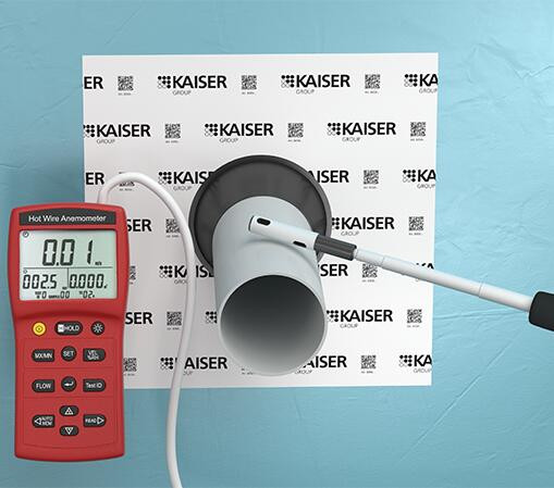 Az öntapadó KAISER légtömör tömítőgallér segítségével légmentesen záró csőbevezetések tisztán és egyszerűen elkészíthetők. A gallérok gyorsabb, stabilabb és mindenekelőtt légmentesebb átmeneteket hoznak létre, mint a rögtönzött módszerek (különbséget lásd a képen műszerrel igazolva). Ügyeljen arra, hogy a felület száraz, por- és zsírmentes legyen. A feldolgozást -5°C-nál magasabb hőmérsékleten kell elvégezni, és a teljes tapadási szilárdság 24 óra elteltével érhető el. A gallérok korlátlan eltarthatósággal rendelkeznek, ha hűvös és száraz szobahőmérsékleten tárolják.