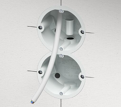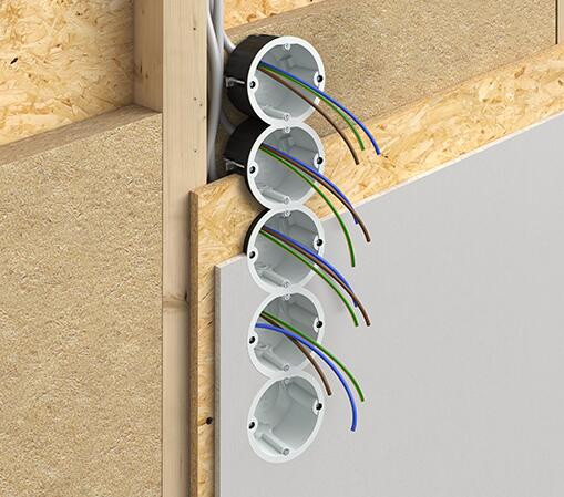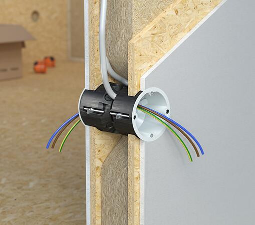 A HWD 90 válaszfal dobozok F30–F120 vagy EI30–EI120 tűzvédelmi falakhoz tanúsított és előírásszerű villamos szerelést tesznek lehetővé. Mostantól fa tartószerkezetű válaszfalakhoz is engedélyezettek F30-B/F60-B minősítésű favázas vagy fapaneles kivitelben – külön kiegészítő intézkedések (pl. burkolás) nélkül.