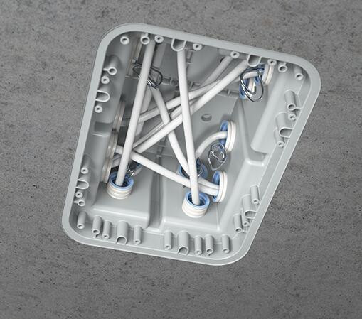 Termékelőnyök: több védőcső fogadása M20-tól M50-ig, zsaluzatra rögzítő szögek (8 db), helytakarékos szállíts (egymásra rakható), merev kialakítás, emelőgyűrűk és lezáró fedlapok, öntés közben belekerült kiszáradt beton könnyen eltávolítható