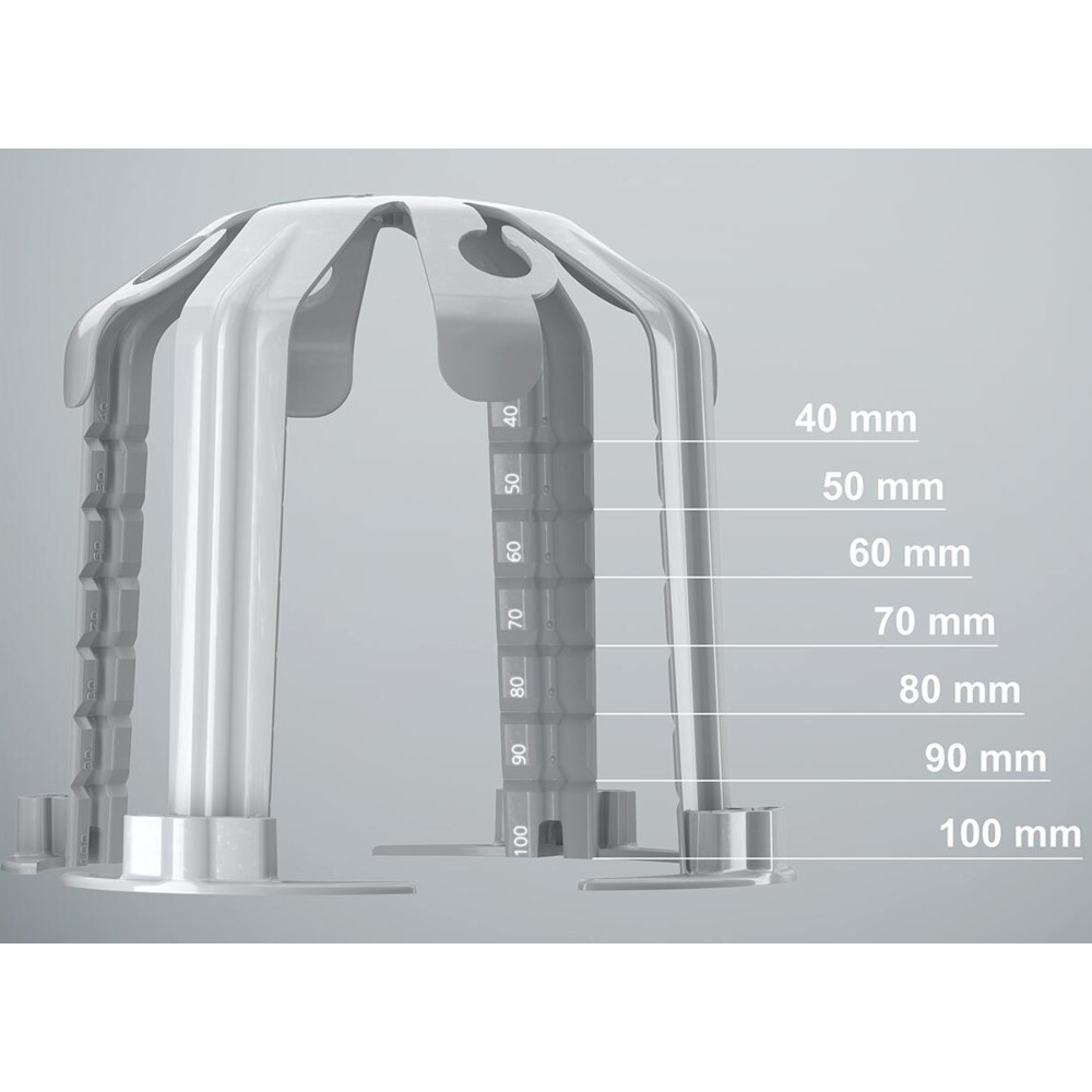 Távtartó forgatható beépített halogén és LED lámpatestek beépítéséhez különféle mennyezeti konstrukciókba. A ház biztosítja a szükséges távolságot a lámpatest és a környező szigetelőanyagok között. Ily módon az olyan anyagok, mint a nedvességzáró / párazáró fólia és a szigetelés, hatékonyan védettek a lámpatest magas üzemi hőmérséklete ellen. Ez a védőintézkedés új épületeknél és utólagos felszerelési munkáknál egyaránt alkalmazható. A távtartó 68 és 80 mm közötti beépítési átmérőkhöz alkalmas, és 40 és 100 mm között különböző beépítési magasságokhoz igazítható. A beszerelés után a távtartó biztonságosan áll a mennyezeten. Ez azt jelenti, hogy a beépítési átmérő teljes mértékben megmarad, és garantálja a biztonságos illeszkedést.