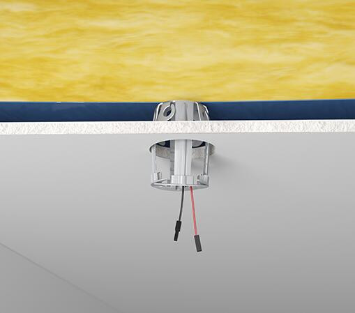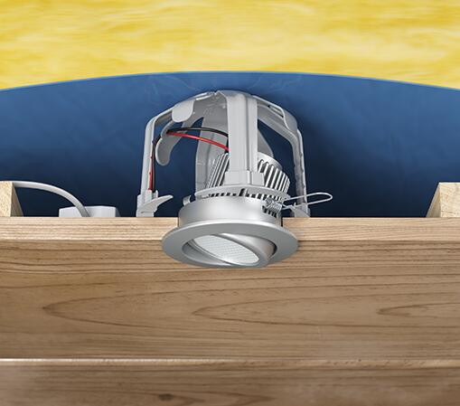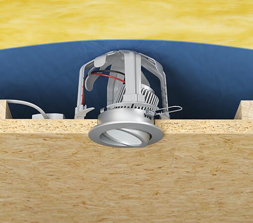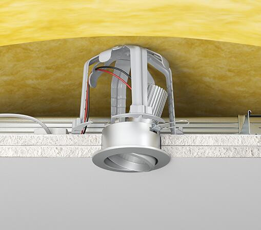 Termékelőnyök: eltartja a szigetelést a lámpától ezzel megakadályozva a melegedésből adodó lehetséges problémákat, lépcsőzetesen csökkenthető a beépítési magasság 100 mm és 40 mm között, utólag is beépíthető 68-80 mm átmérőjű nyíláson keresztül, vezetéktartó akasztók az eszköz tetején