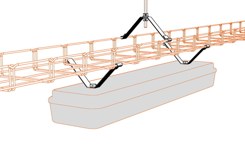 A DZM3/150 központi akasztó kifejezetten 150/50 és 150/100 mm-es hálótálcák felfüggesztésére szolgál M8 menetes szárakhoz. Különböző típusú lámpatestek felszereléséhez is ajánlott a rácsos kábeltálca rendszer aljára (lásd a képgalériában). Az ajánlott maximális teherbírás 50 kg.