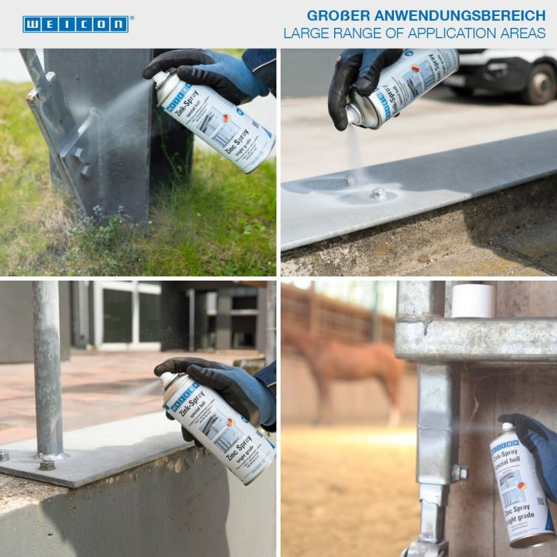A WEICON Cink Spray „fényes” minden fémfelület számára tartós katódos korrózióvédelmet biztosít. Világos színárnyalata a friss tűzihorganyzáshoz igazodik. Gyorsan száradó, jól tapadó, mikrorészecskés cinkpelyhekből álló védőréteget képez, amely még szélsőséges időjárási és környezeti hatások ellen is hatékony védelmet nyújt.
