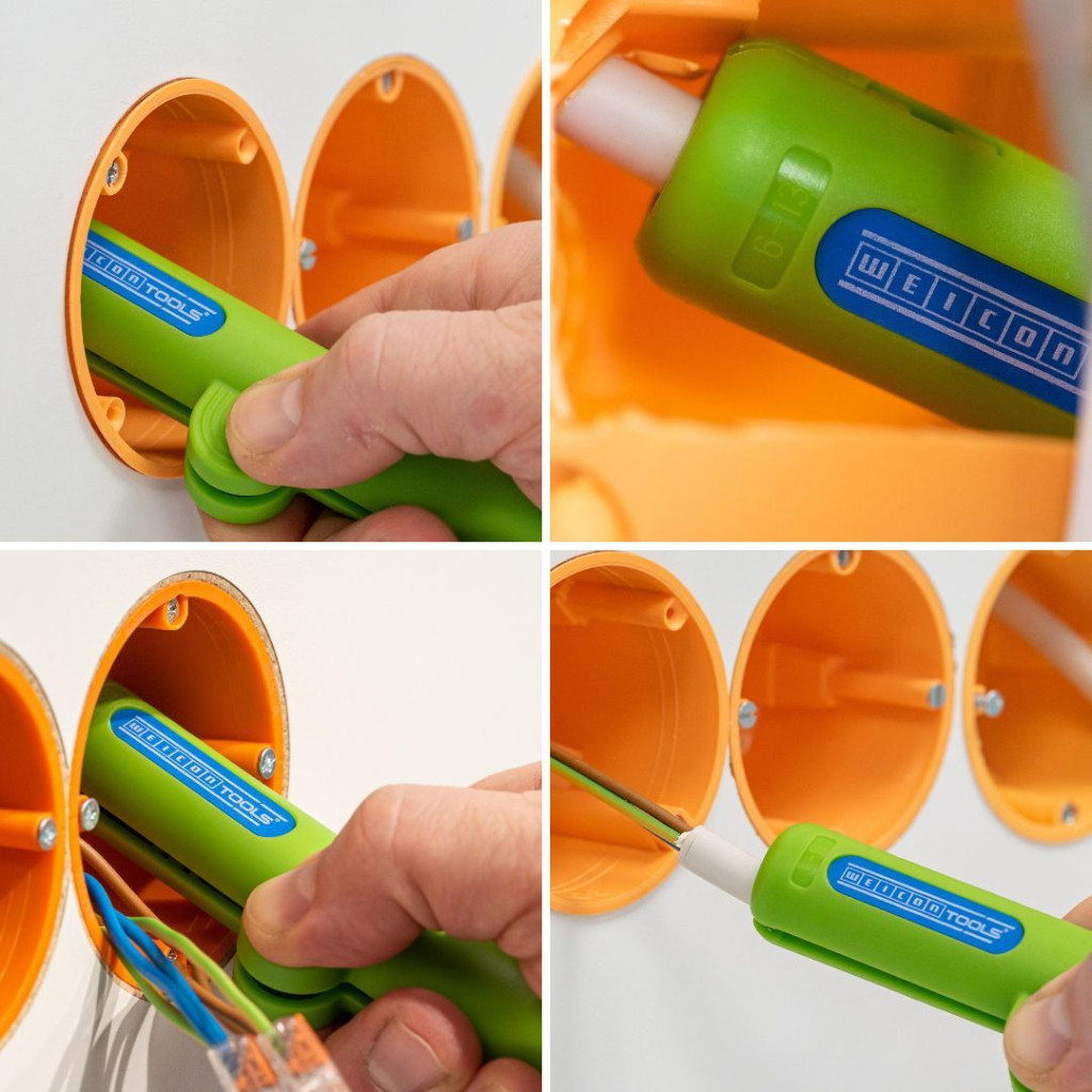 A WEICON Körkábelcsupaszoló No. 13 Green Line gyors és kényelmes megoldást kínál minden elterjedt kör- és vizes helyiségekbe szánt kábel blankolására 6,0–13,0 mm átmérő között (pl. NYM kábelek 3×1,5 mm²-től 5×2,5 mm²-ig). A vágási mélység kézi beállítása nem szükséges, így a szerszám kisebb vezetékekhez (pl. 3×0,75 mm²) is használható.