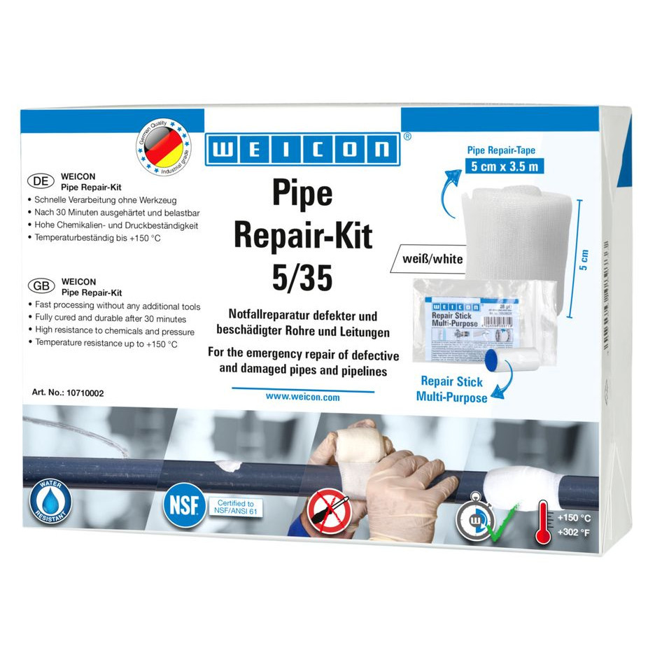 A készlet ideális sérült vagy meghibásodott csővezetékek sürgősségi javításához. Tartalmaz egy WEICON Repair Stick Multi-Purpose javítórudat, egy speciális, üvegszál-erősítésű műanyagból készült javítószalagot, egy pár védőkesztyűt, valamint a szerelési útmutatót.